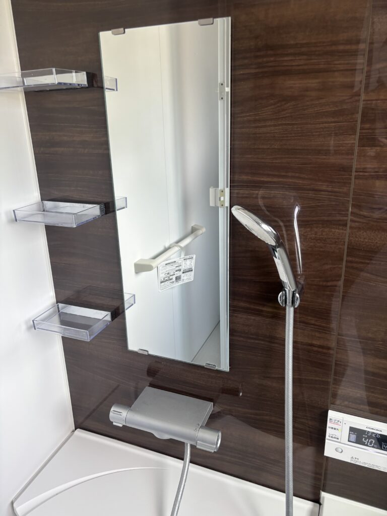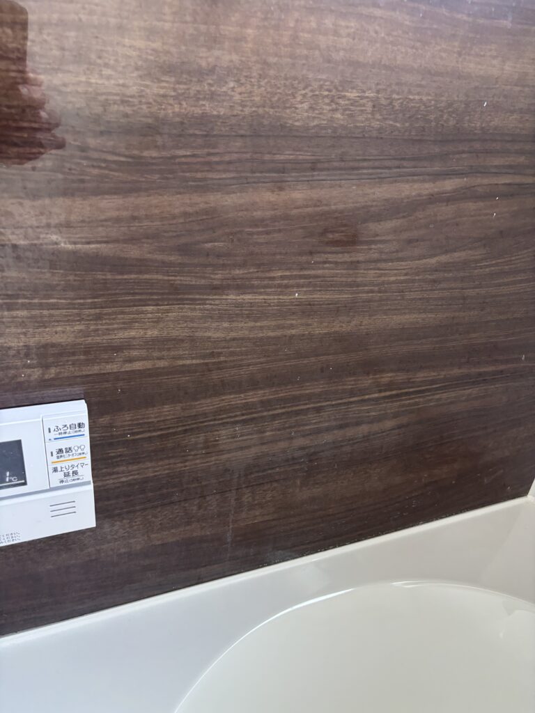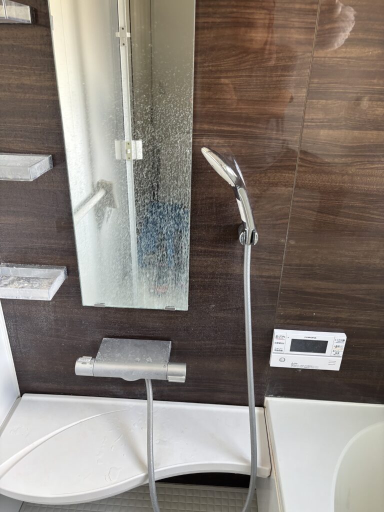水垢が取れてスッキリしてます。元々鏡面の壁ですので、お風呂場にいる人が映り込むんですが、水垢だらけだと曇ってあまり見えなくなります。