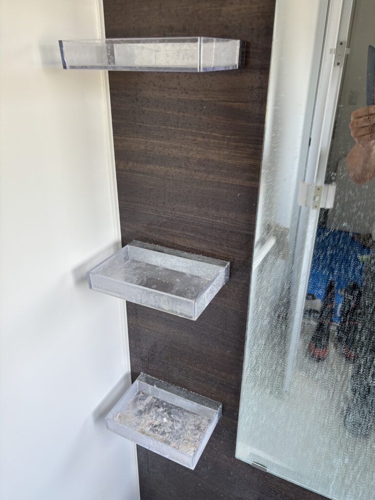 鏡面の壁は、粗いパッドなどで擦ると傷が付くので絶対にゴシゴシやらないで下さい。この手の汚れはゴシゴシやっても取れませんので。